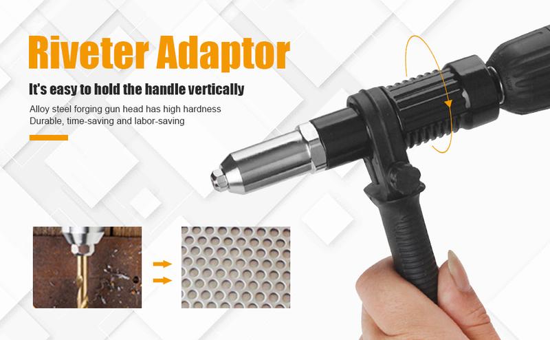 Material: This rivet gun adapter tool is made of Alloy steel forged pipe head for durability; The aluminum casting housing will give you a comfortable grip, light weight and easy to carry, and you will not get tired of working for a long time; The handle is made of hard plastic, which pulls the rivet quickly and is not easy to slip